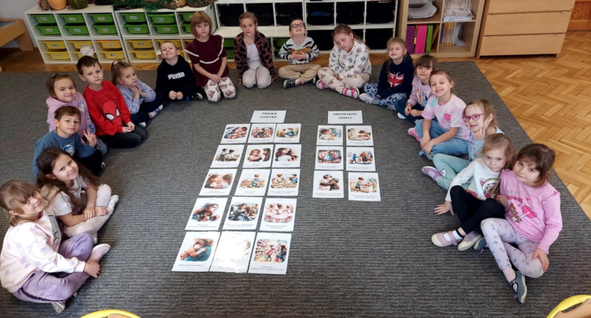 W dniu dzisiejszym podczas zajęć w poszczególnych grupach odbyły się pogadanki i zabawy przybliżajace przedszkolakom tematyką praw i obowiązków dzieci. Były filmy edukacyjne dotyczące praw dziecka oraz prezentacje multimedialne, które w przystępny sposób przybliżyły im najważniejsze zasady wynikające z Konwencji o prawach dziecka. Był wiersza M. Bryczyńskiego pt. „Prawa dziecka”, dzięki któremu mogły lepiej zrozumieć, że każde dziecko ma prawo do miłości, bezpieczeństwa, nauki i zabawy. Dzieci odgrywały scenki tematyczne, rozwiązywały wspólne quizy a na koniec zajęć wykonały prace plastyczne. Dzieci pracowały z dużym zaangażowaniem i kreatywnością.